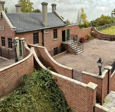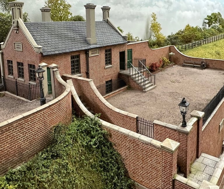 There is still work to do around the exit gateway where the wall of the forecourt meets the curved wall by the roadside. This is a difficult area and probably best sorted out with everything in place - a matter of joining the dots.